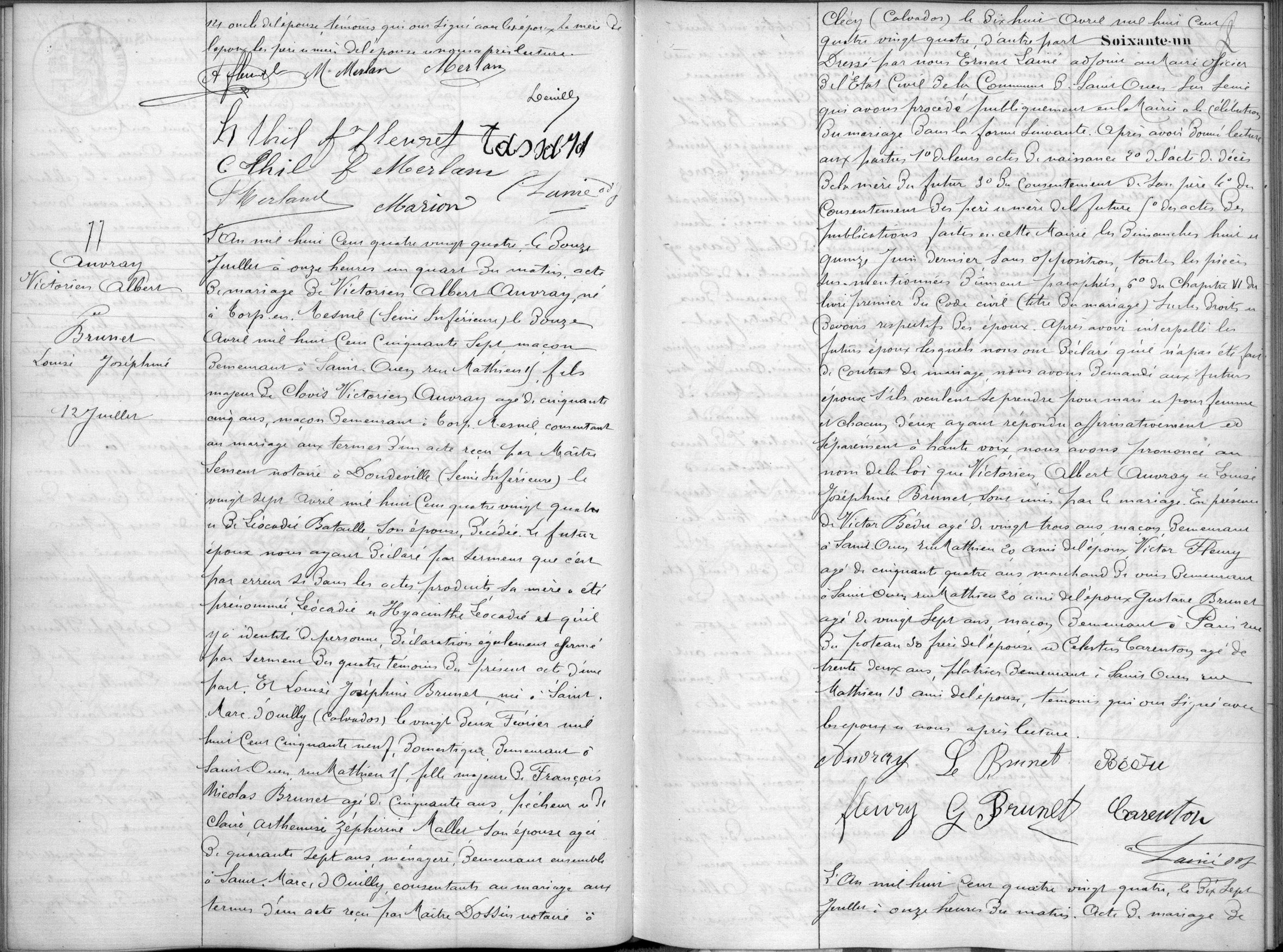 Dans ces pages, on apprend diverses choses intéressantes outre le détail des actes perpétrés par le nécrophile. Déjà, on constate que les racines du Mal ne s’enchevêtrent surement pas dans les siècles passés (on s’en doutait déjà hein, c’est juste un prétexte…) mais baignent tout simplement dans l’alcool. Une jeunesse un peu sombre gâchée par l’épilepsie et saccagée par l’alcool. Ce qui lui vaudra des circonstances atténuantes si j’ai bien compris. On apprend aussi que ses parents sont toujours vivants en 1886 puisqu’ils témoignent au procès. Que Henri est marié depuis juillet 1884 et a un enfant (et vit séparé de son épouse excédée par son alcoolisme). C’est ce détail qui m’a permis de continuer : juillet 1884, c’est suffisamment précis. J’ai donc cherché dans les archives municipales en ligne de Saint-Ouen qui proposent les numérisations des actes civils et paroissiaux de la ville. Toutes les villes ne font pas ça, déjà parce que toutes les villes ne maintiennent pas une copie des archives (passé 75 ans les archives stockées dans la mairie vont dans les archives départementales). Comme c’est le cas pour les archives de Saint-Ouen, ça veut dire qu’il y a un jeu d’archives qui est parti aux archives départementales et qu’il y a un jeu qui est conservé par la mairie de Saint-Ouen. Ou sinon, ils ont seulement conservé une copie de la numérisation. C’est probablement ça d’ailleurs maintenant que j’y réfléchis mais c’est quand même méritoire : il faut assumer la mise en ligne, le serveur, etc. Toutes les villes ne peuvent pas se le permettre. J’ai donc trouvé l’acte de mariage entre Henri BLOT et Eugénie CAREZ le 17 juillet 1884 à Saint-Ouen :